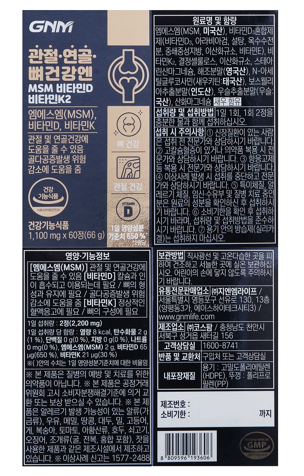 | 제품명 | 관절 연골 뼈건강엔 MSM 비타민D 비타민K2 | 제조업소의 명칭과 소재지 | 컨텐츠참조 |