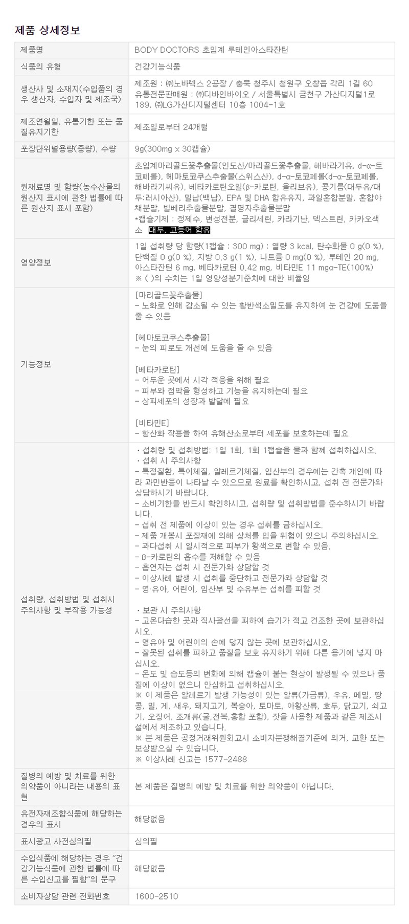 | 제품명 | BODY DOCTORS 초임계 루테인아스타잔틴 | 제조업소의 명칭과 소재지 | 컨텐츠 참조 |