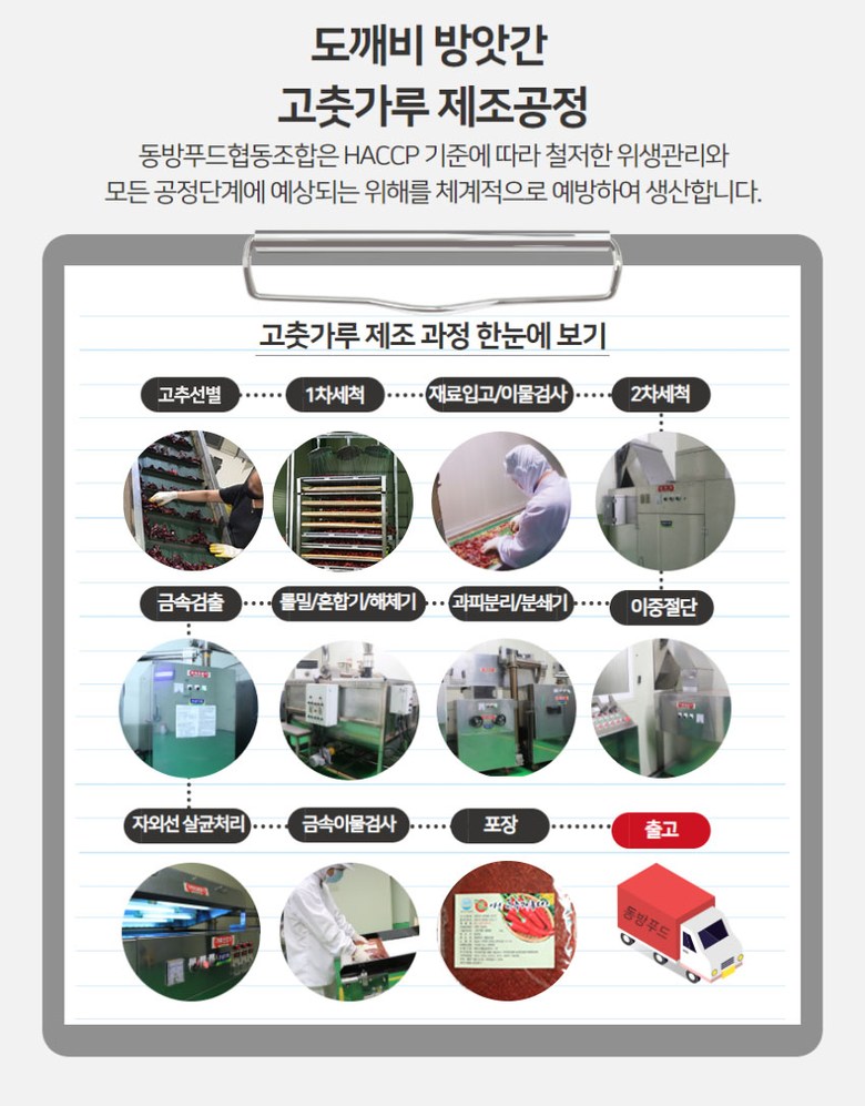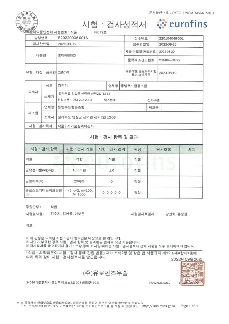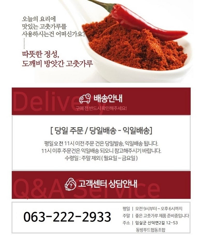| 생산자 및 소재지 | 김인기/동방푸드협동조합 임실군 신덕면 | 제조연월일, 소비기한 또는 품질유지기한 | 제조일자 : 매일 제조 유통기한 : 제조일로부터 1년 |