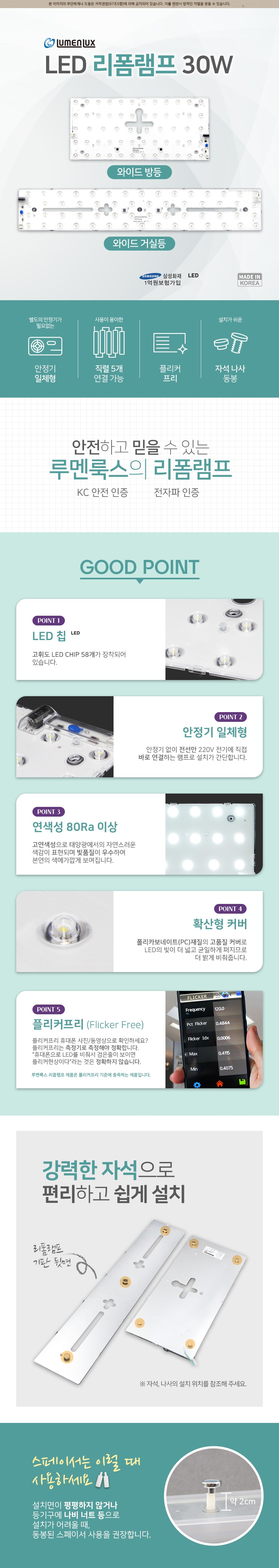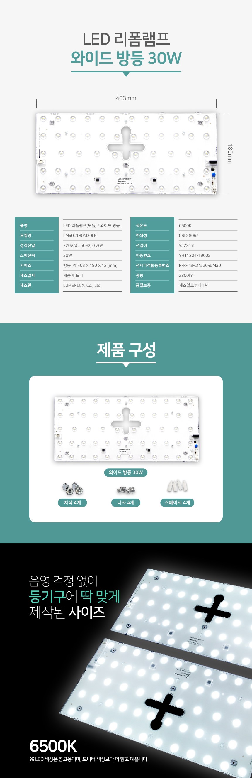 | 품명 및 모델명 | LED램프(모듈) / LM400180M30LP | KC 인증정보 | YH11204-19002B, R-R-lml-LM52045M30 |