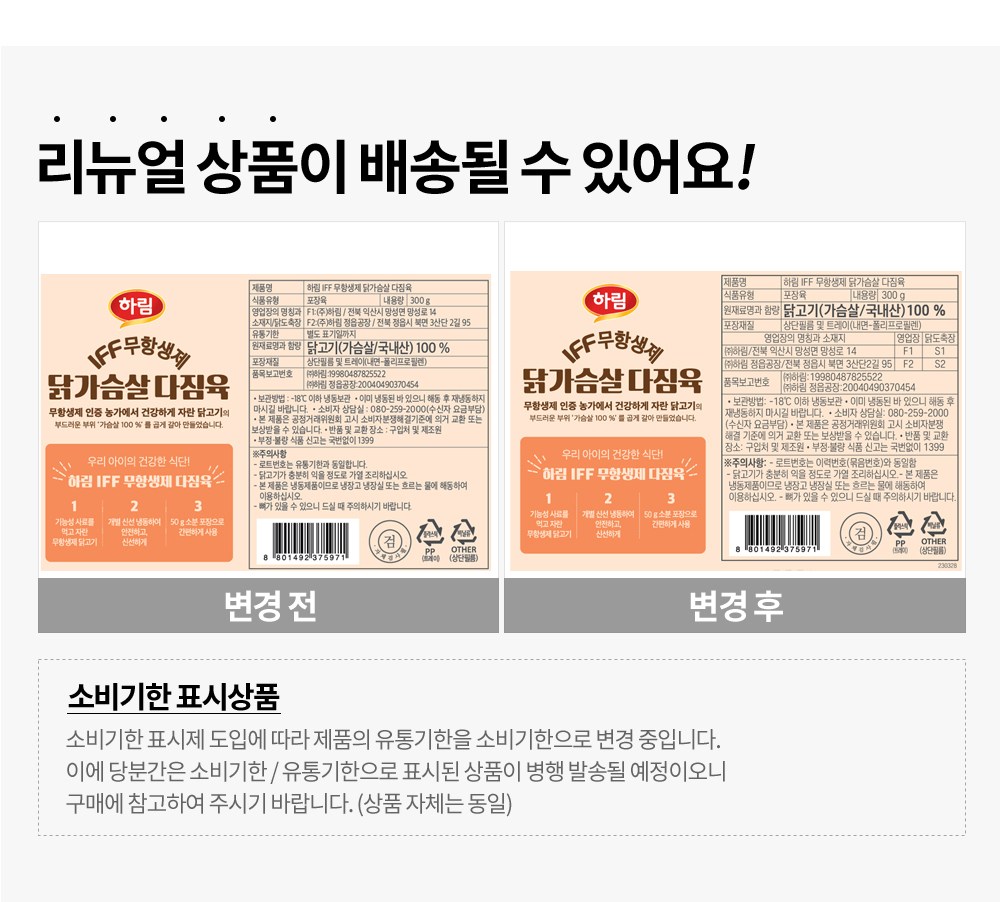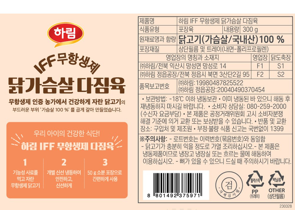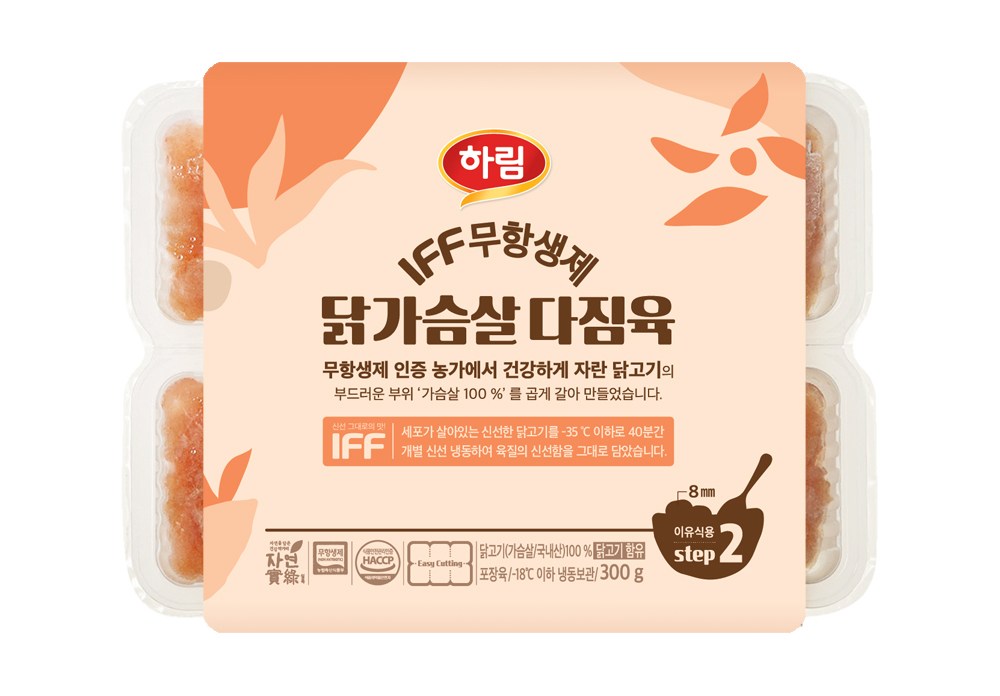 | 품목 또는 명칭 | 하림 IFF 무항생제 닭가슴살 다짐육 | 포장단위별 내용물의 용량(중량),수량,크기 | 300g, 1개 |