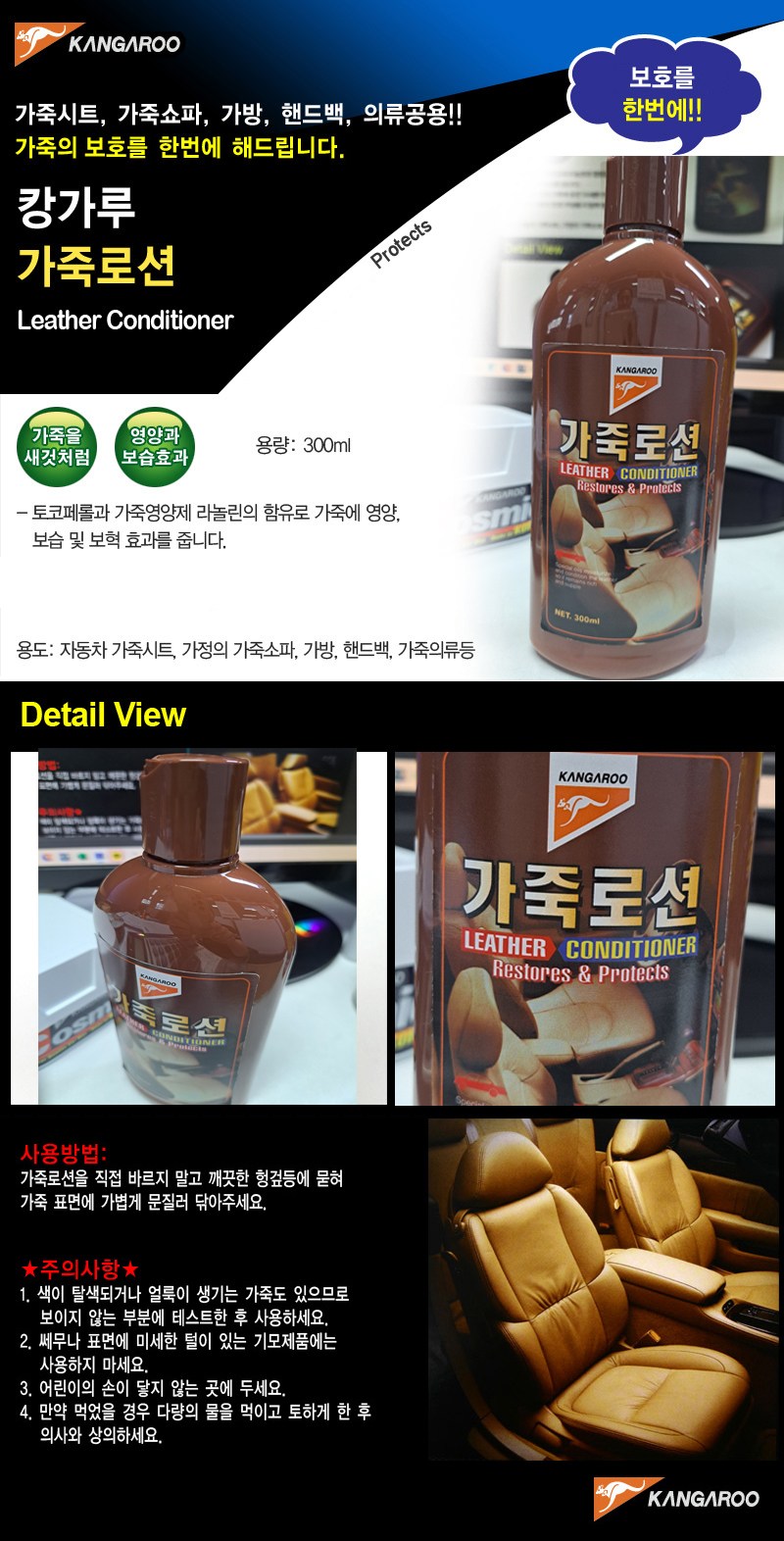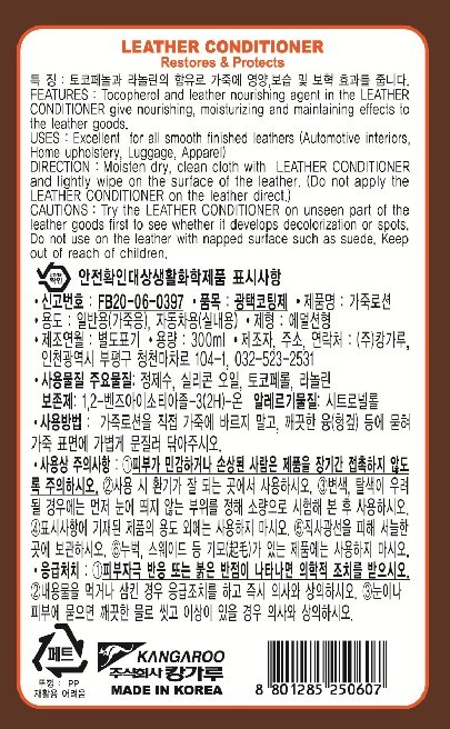 | 품목 및 제품명 | 광택코팅제 / 가죽로션 | 용도(표백제의 경우 계열을 함께표시) 및 제형 | 일반용 (가죽용), 자동차용 (실내용) / 에멀션형 |