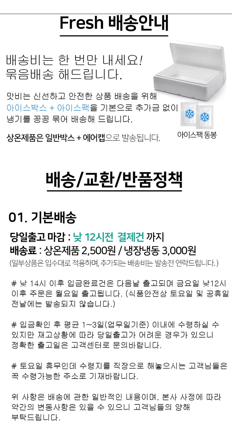 | 배송방법 | 신선/냉장/냉동 | 배송비 | 3,500원 · 도서산간 추가 배송비 - 제주 지역: 3,500원 - 도서산간 지역: 6,500원 |