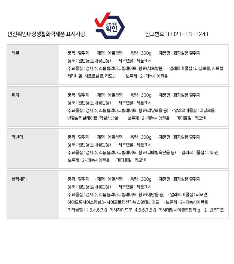 | 품목 및 제품명 | 상품 상세페이지 참조 | 용도(표백제의 경우 계열을 함께표시) 및 제형 | 상품 상세페이지 참조 |