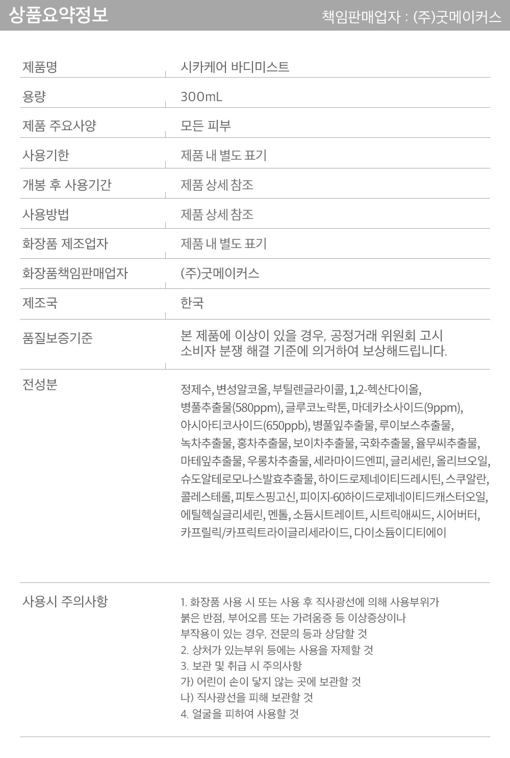 | 용량(중량) | 300ml | 제품 주요 사양 | 모든 피부용 |