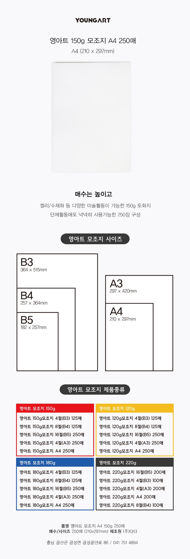 | 품명 및 모델명 | 영아트 150g모조지 A4 | 인증/허가 사항 | 해당사항없음 |