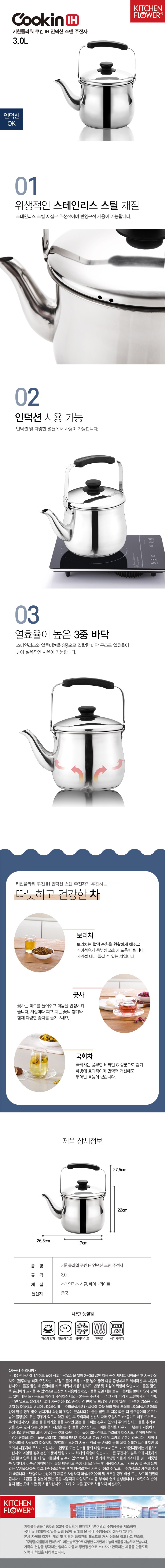 | 품명 및 모델명 | 키친플라워 쿠킨 IH 인덕션 스텐 주전자 3.0L | 재질 | 컨텐츠참조 |