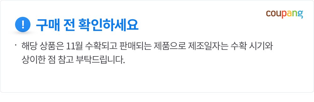 | 제조연월일, 소비기한 또는 품질유지기한 | 업데이트 예정 | 세부 품목군별 표시사항 | 농수산물 : -유전자변형 : 해당없음 - 지리적 표시사항 : 해당없음 |