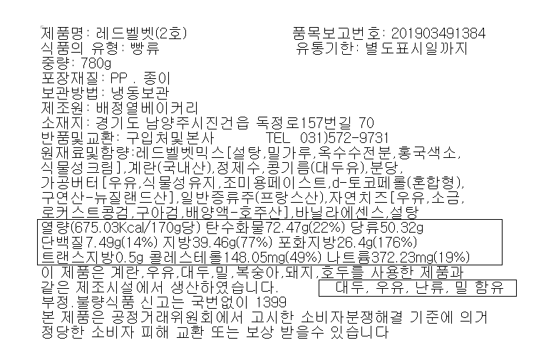 | 제품명 | 레드벨벳케이크 2호 | 식품의 유형 | 빵류 |