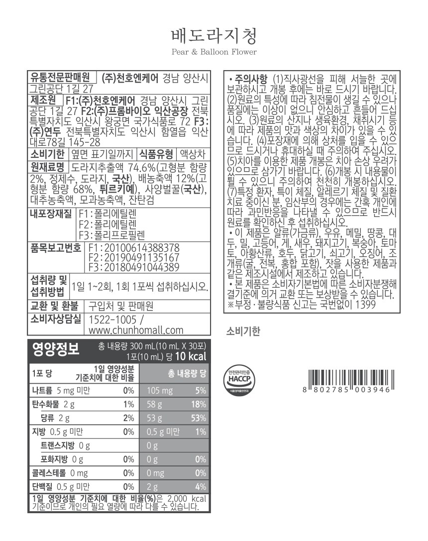 | 제품명 | 배도라지청 | 식품의 유형 | 컨텐츠 참조 |