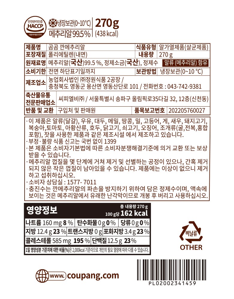 | 제품명 | 곰곰 깐메추리알 | 식품의 유형 | 컨텐츠 참조 |