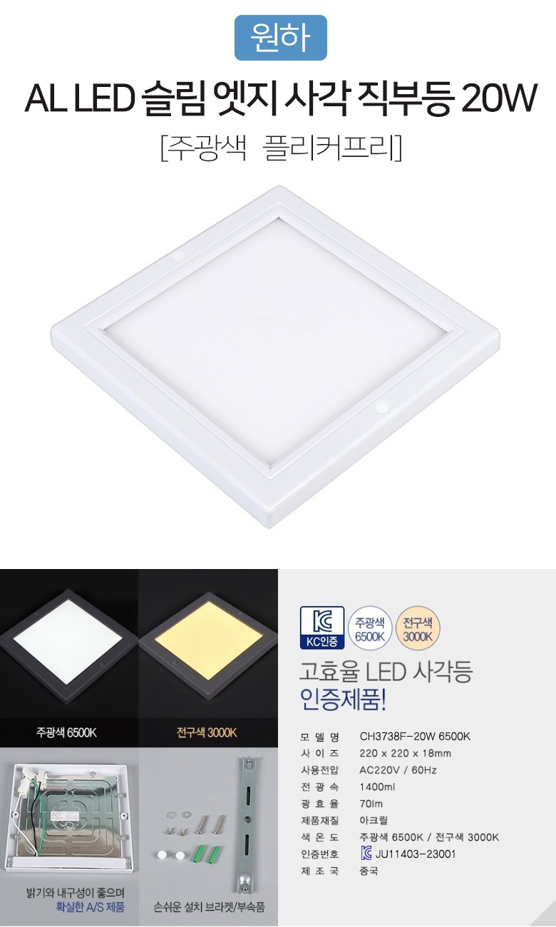 | 품명 및 모델명 | CH3738F-20W 6500K | KC 인증정보 | JU11403-23001, R-R-CLt-CH373820WFS |