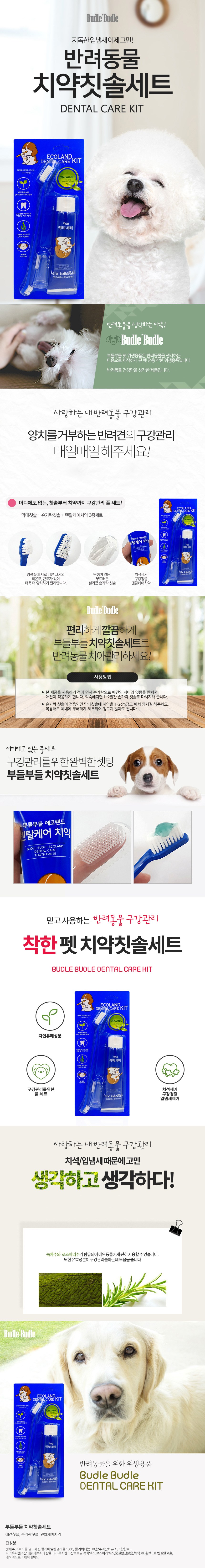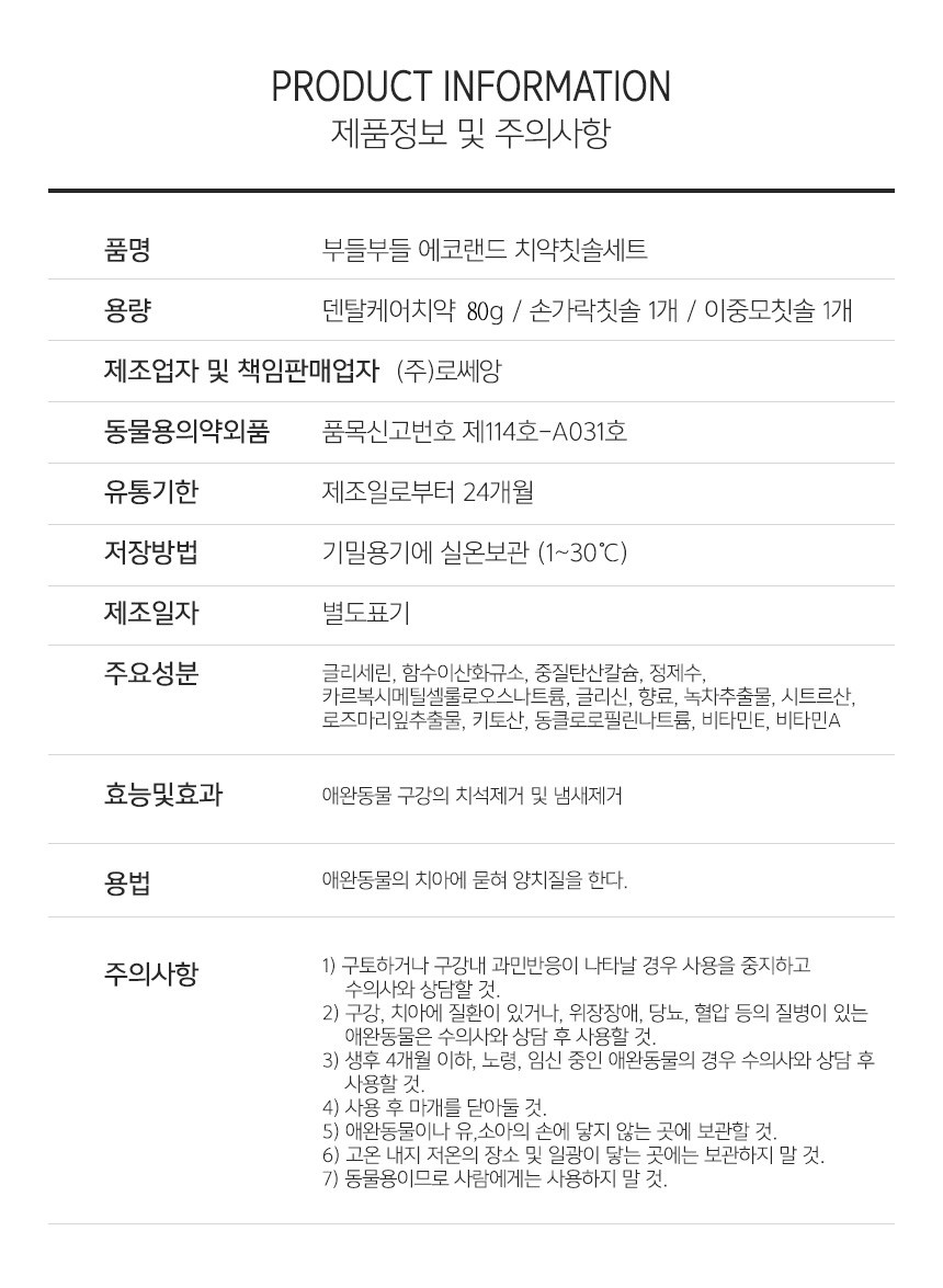 | 품명 및 모델명 | 부들부들 에코랜드 덴탈 케어 치약 (치약칫솔 세트) | 인증/허가 사항 | 치약 : 동물용 의약외품 / 칫솔 : 해당없음 |