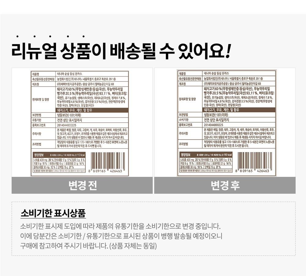 | 제품명 | 무항생제 등심 돈까스 | 식품의 유형 | 분쇄가공육제품(비살균제품/가열하여 섭취하는 냉동축산물) |