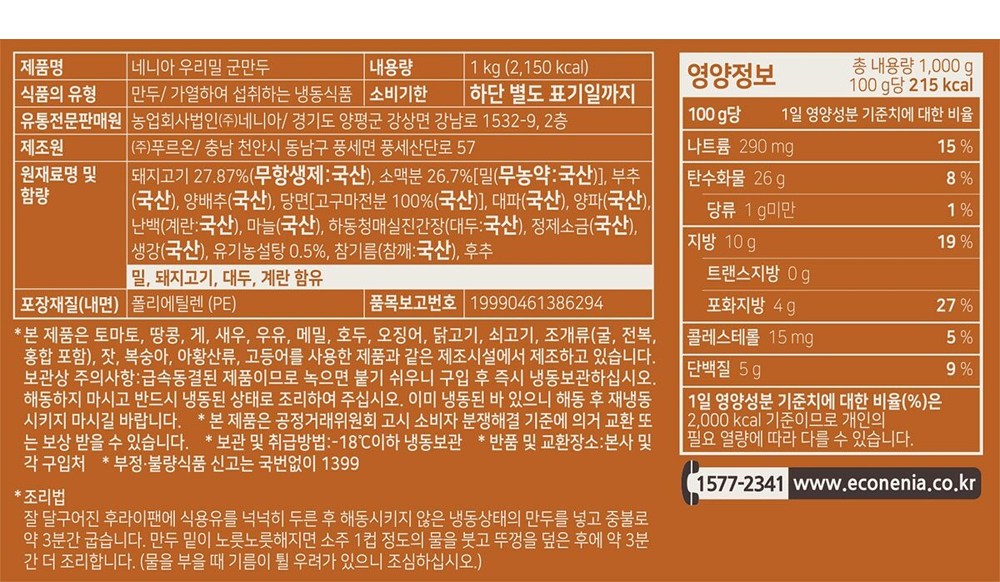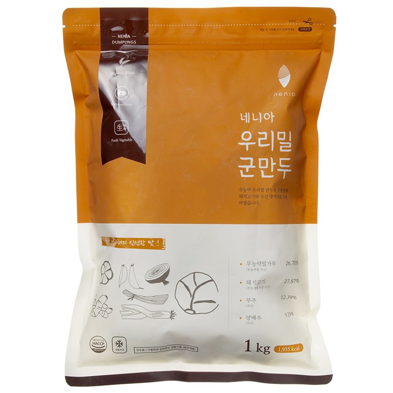 | 제품명 | 네니아 우리밀 군만두 | 식품의 유형 | 만두류(가열하여 섭취하는 냉동식품/살균제품) |