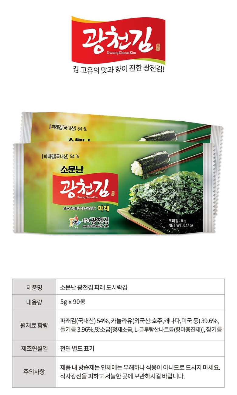 | 품목 또는 명칭 | 소문난 광천김 파래 도시락김 | 포장단위별 내용물의 용량(중량),수량,크기 | 5g,90봉,1박스 |