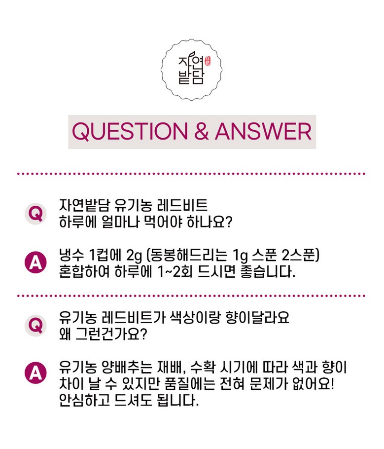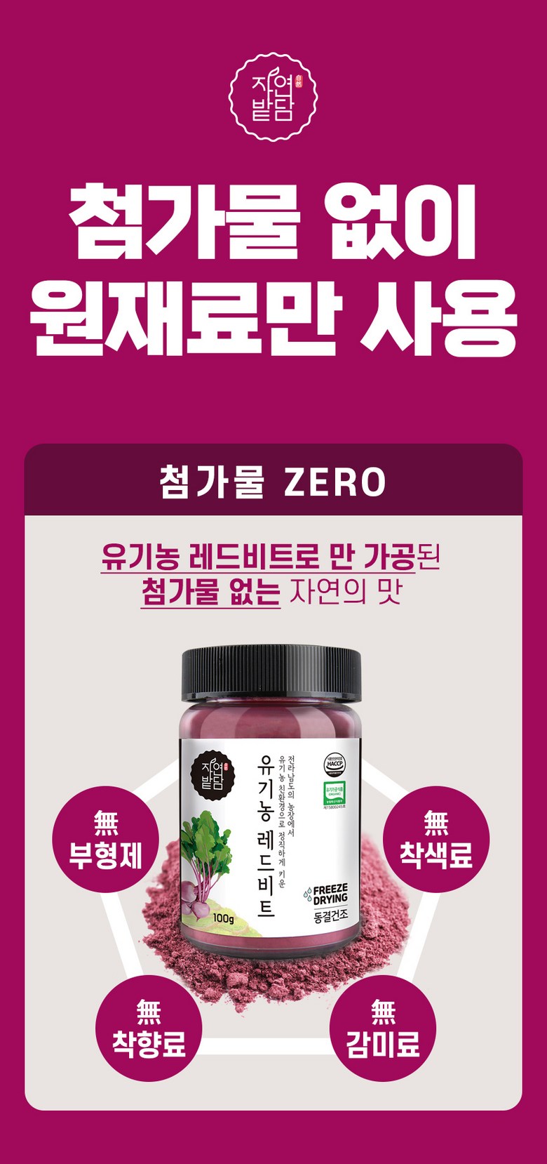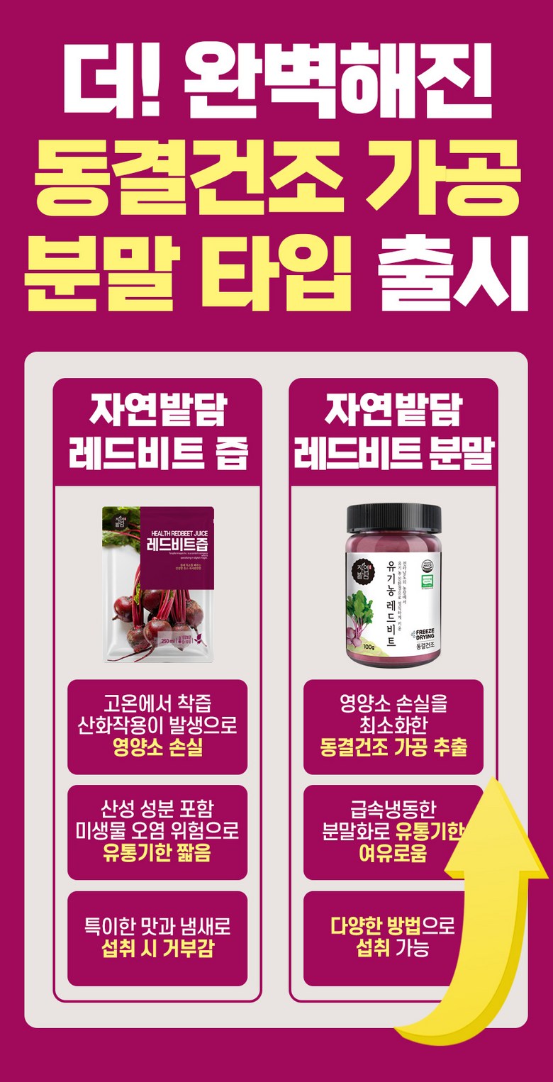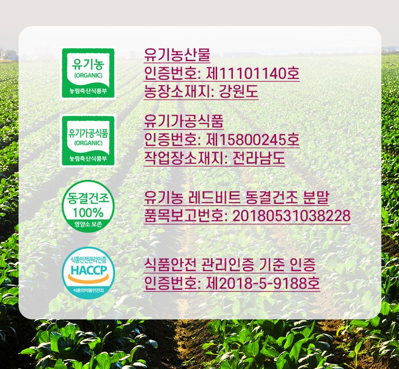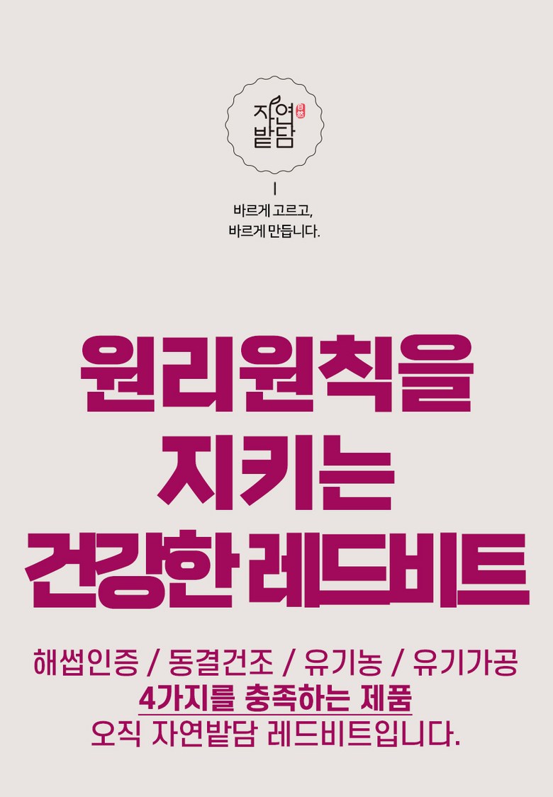 | 제품명 | 자연밭담 유기농 레드비트 동결건조 | 식품의 유형 | 과채가공품 |