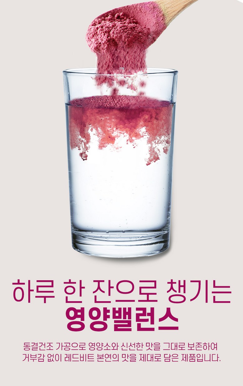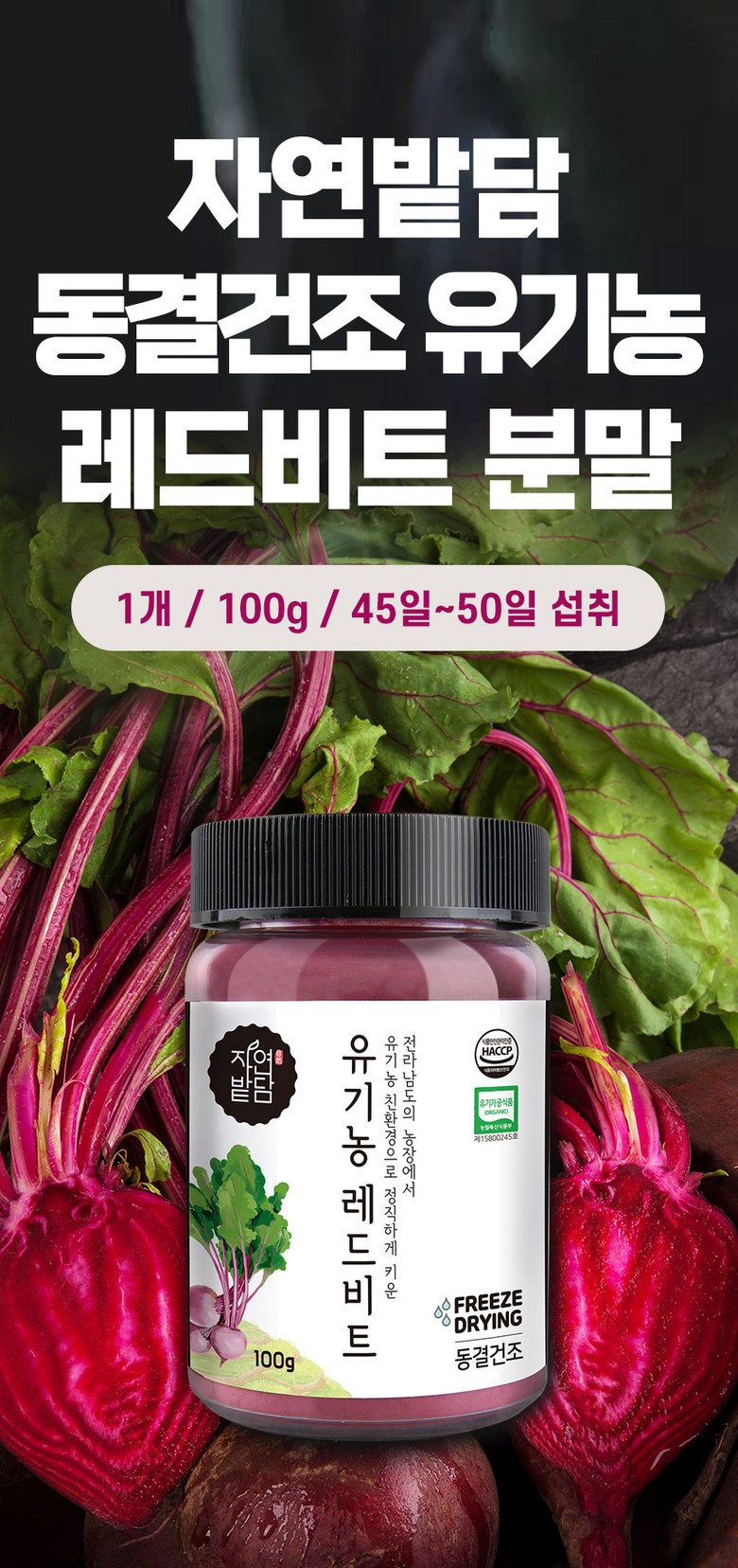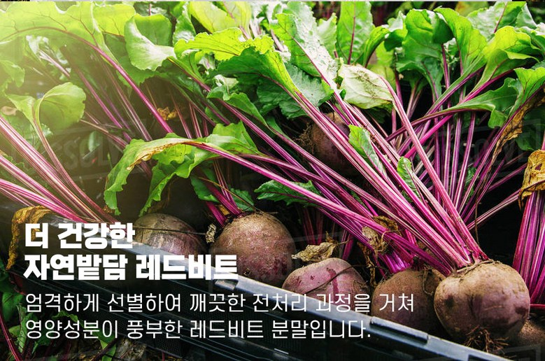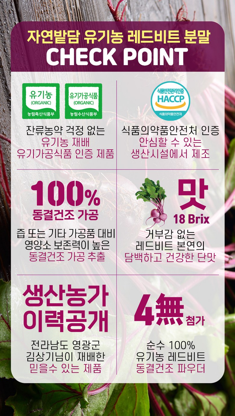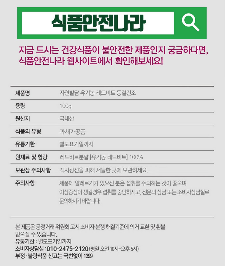 | 포장단위별 내용물의 용량(중량), 수량 | 1통*100g | 원재료명 및 함량 | 레드비트분말[유기농 레드비트] 100% |