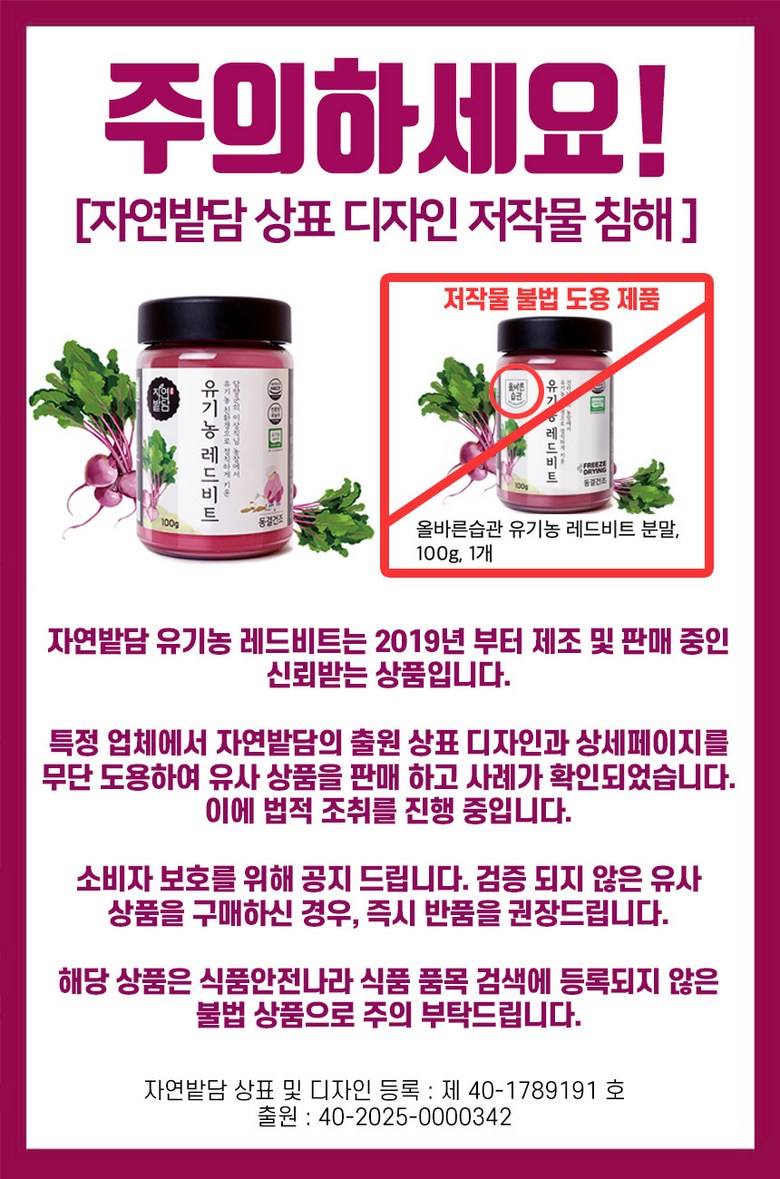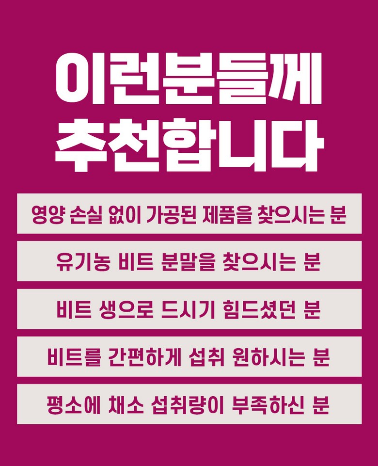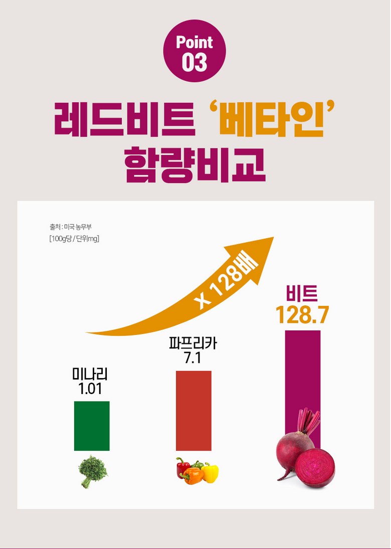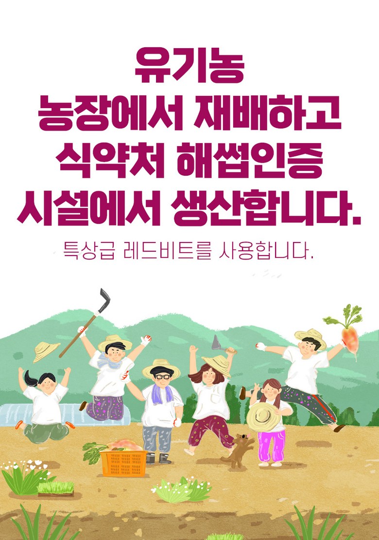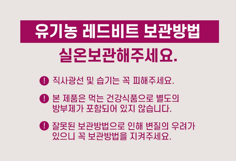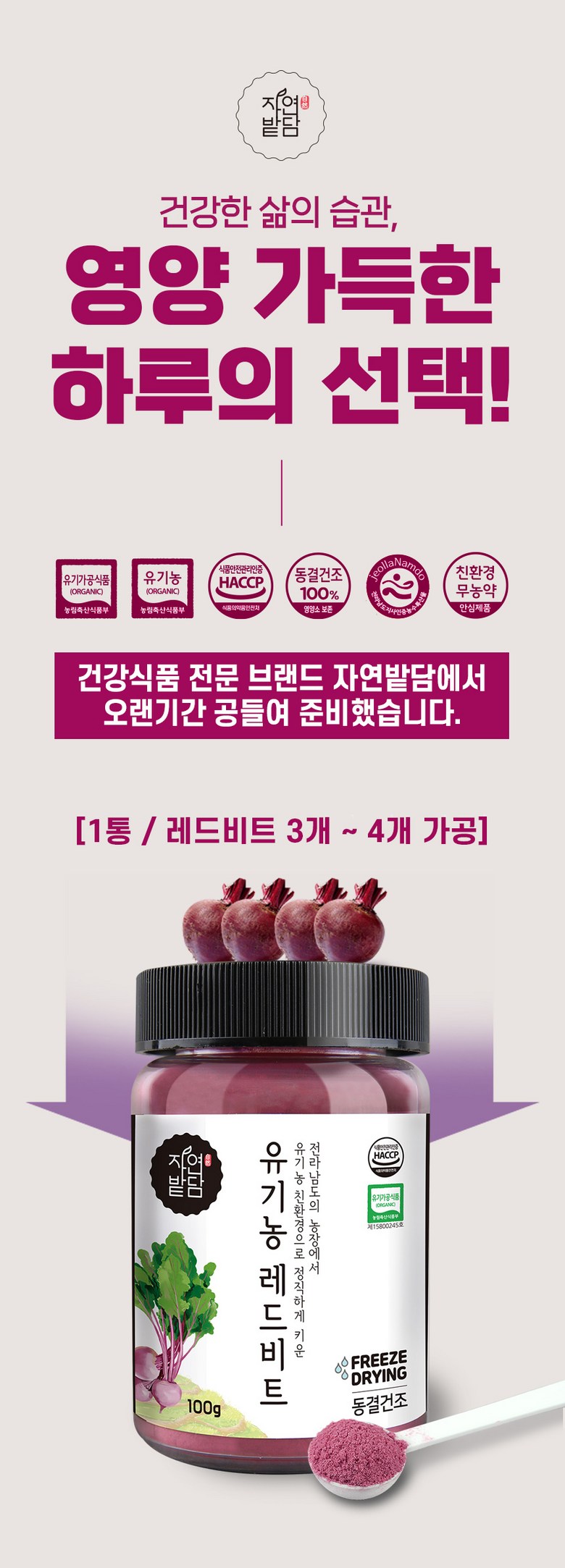 | 포장단위별 내용물의 용량(중량), 수량 | 1통*100g | 원재료명 및 함량 | 레드비트분말[유기농 레드비트] 100% |