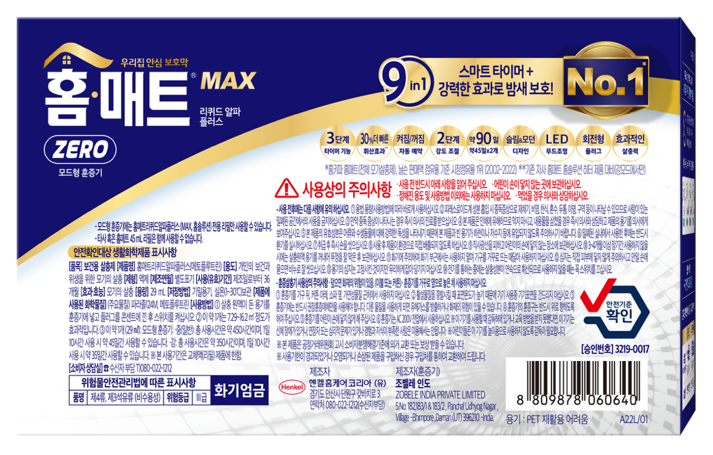 | 효과,효능 (승인대상 제품에 한함) | 모기 구제 | 수입자(수입제품에 한함), 제조국 및 제조사 | 컨텐츠참조 |