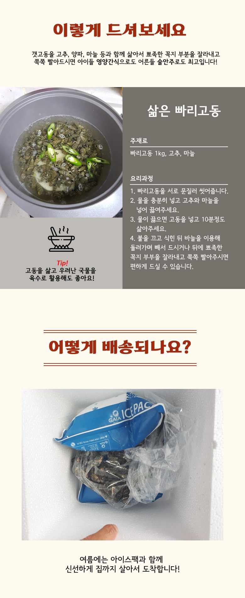 | 품목 또는 명칭 | 갯고동 빠리고동 살아서 싱싱하게 | 포장단위별 내용물의 용량(중량),수량,크기 | 1인분=1kg |