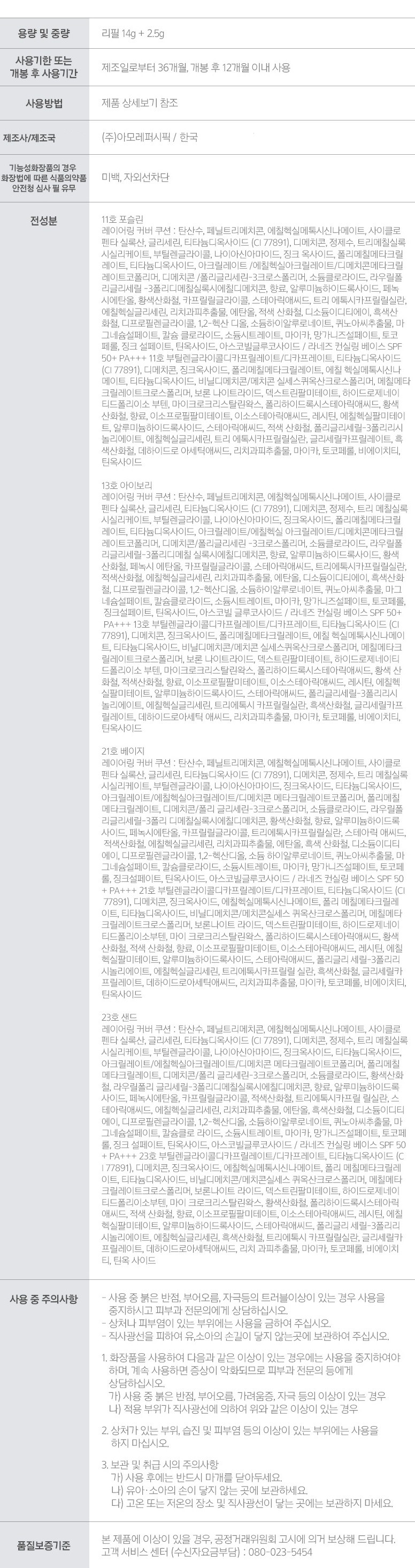 | 용량(중량) | 리필 14g + 퍼프 2.5g | 제품 주요 사양 | 모든피부용 |