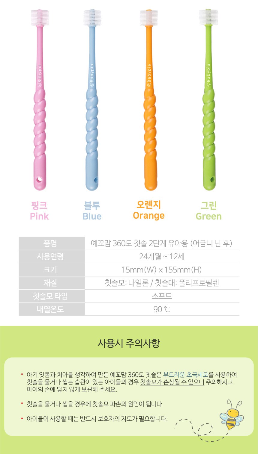 | 품명 및 모델명 | 예꼬맘 360도 2단계 유아 칫솔 | KC 인증정보 | 유/KC마크 |