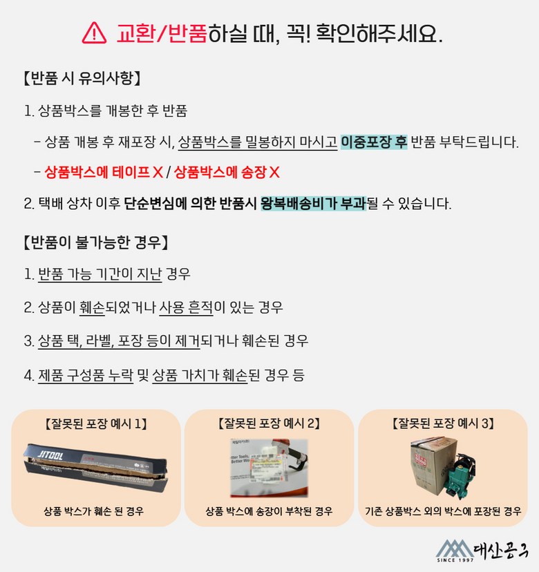 - ㆍ교환/반품에 관한 일반적인 사항은 판매자가 제시사항보다 관계법령이 우선합니다.