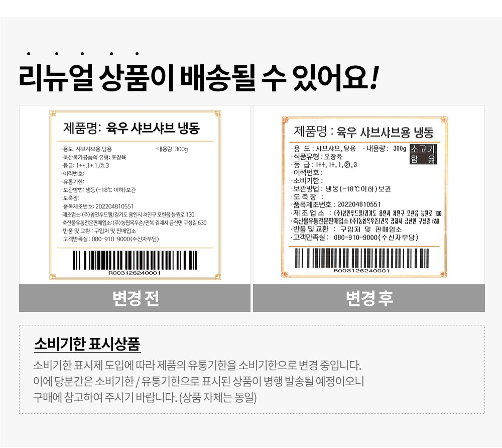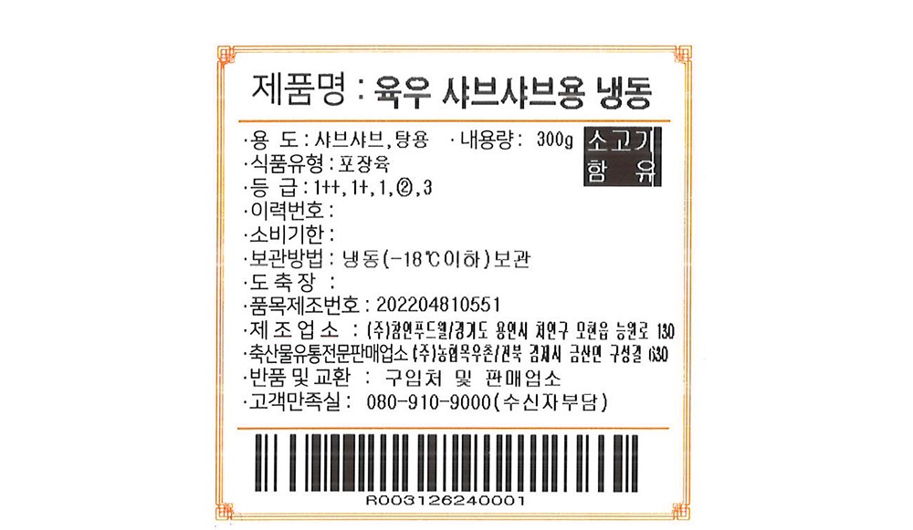 | 품목 또는 명칭 | 육우 샤브샤브 냉동 | 포장단위별 내용물의 용량(중량),수량,크기 | 300g x 3개,1개 |