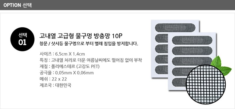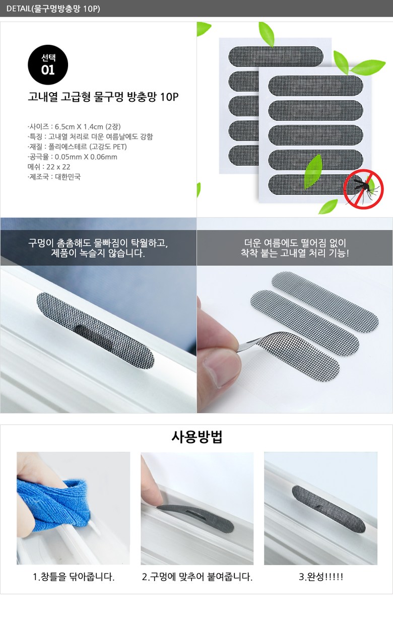 | 품명 및 모델명 | 피톤치드 물구멍방충망 | 인증/허가 사항 | 없음 |