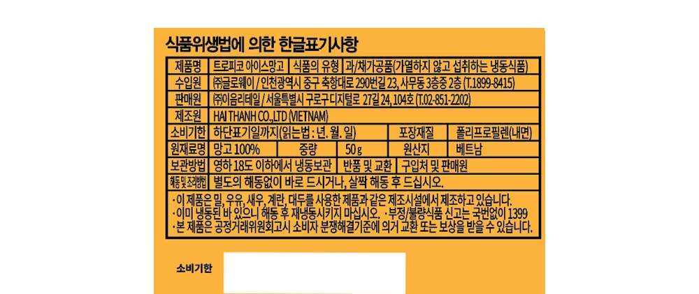 | 제품명 | 아이스망고 | 식품의 유형 | 과/채가공품(가열하지 않고 섭취하는 냉동식품) |
