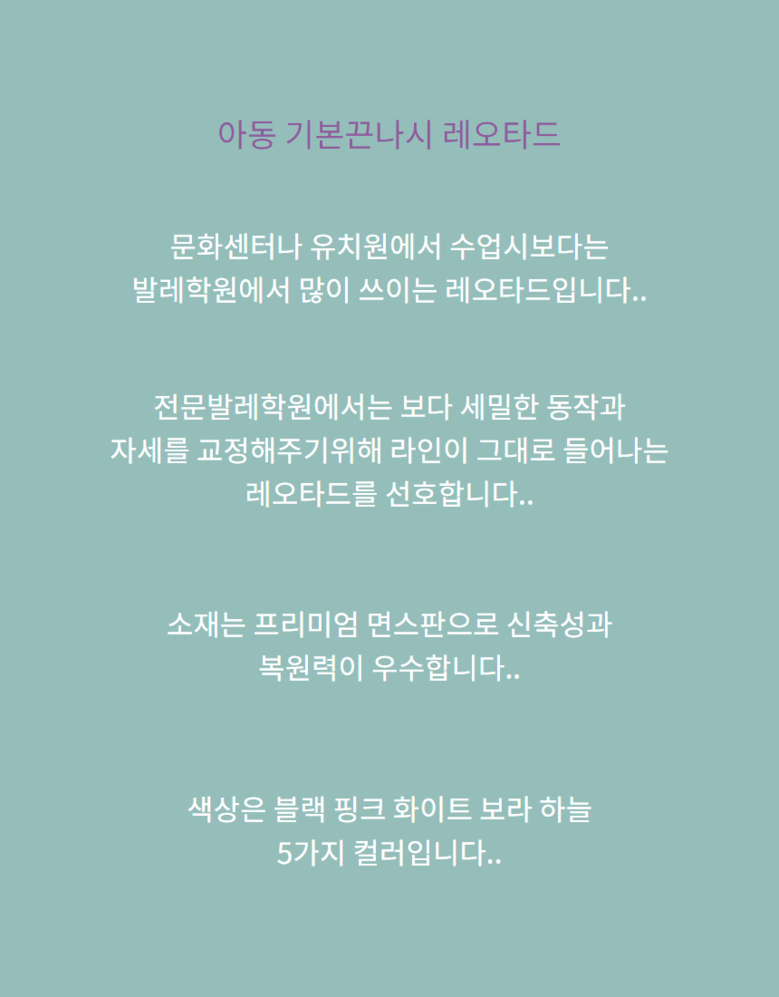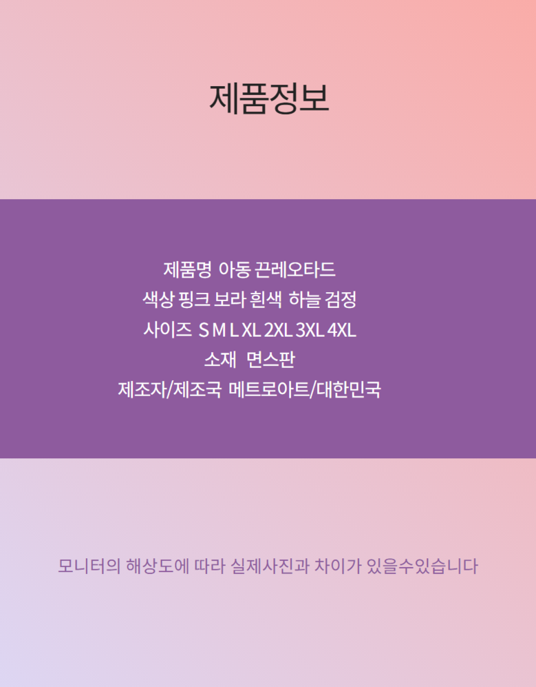 | 제품 소재 | 면스판 | 색상 | 블랙/화이트/핑크/하늘/보라 |