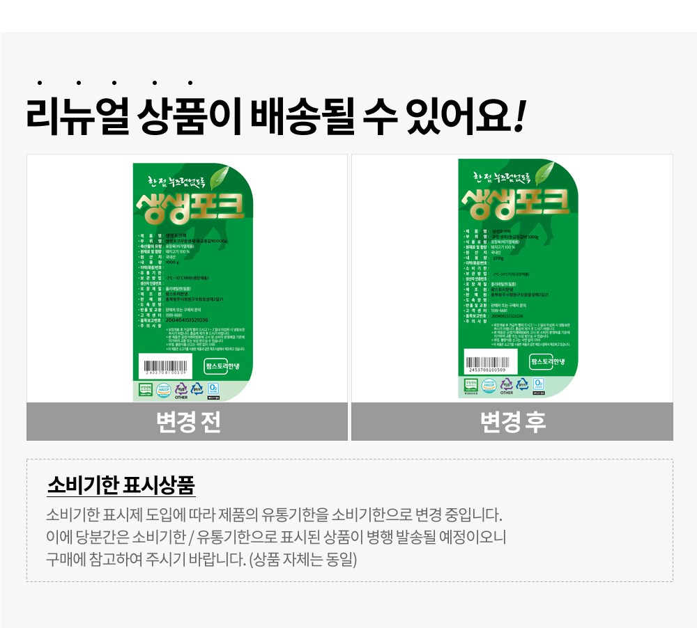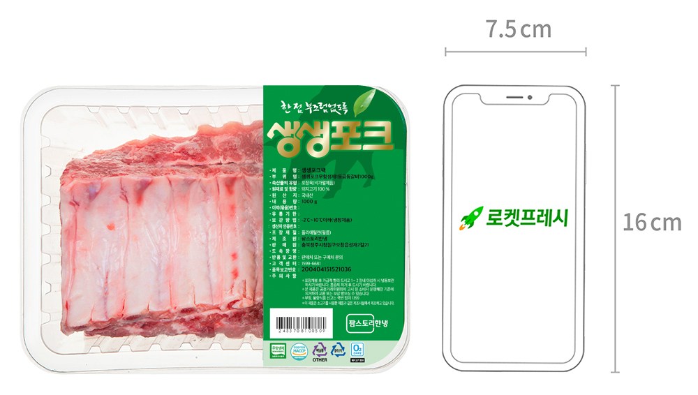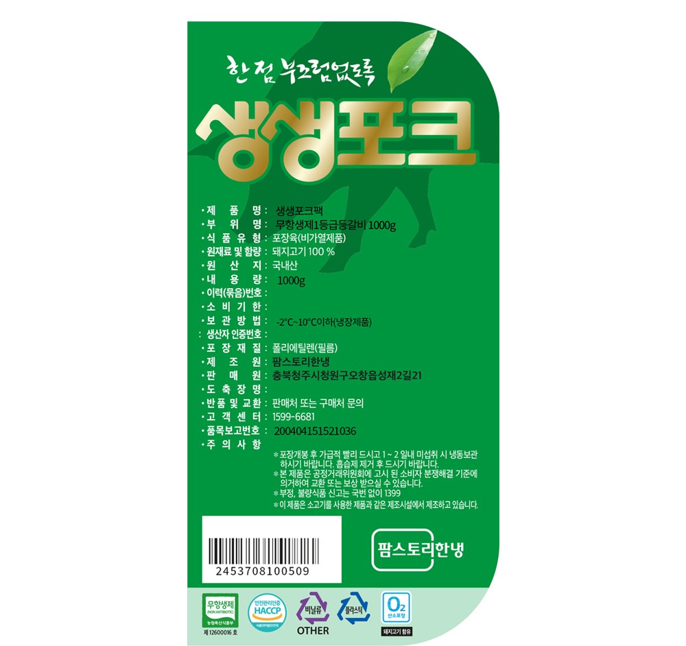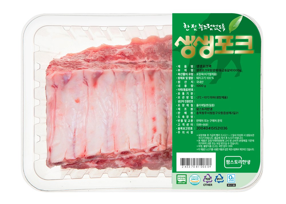 | 품목 또는 명칭 | 생생포크팩 | 포장단위별 내용물의 용량(중량),수량,크기 | 1kg x 6개 |