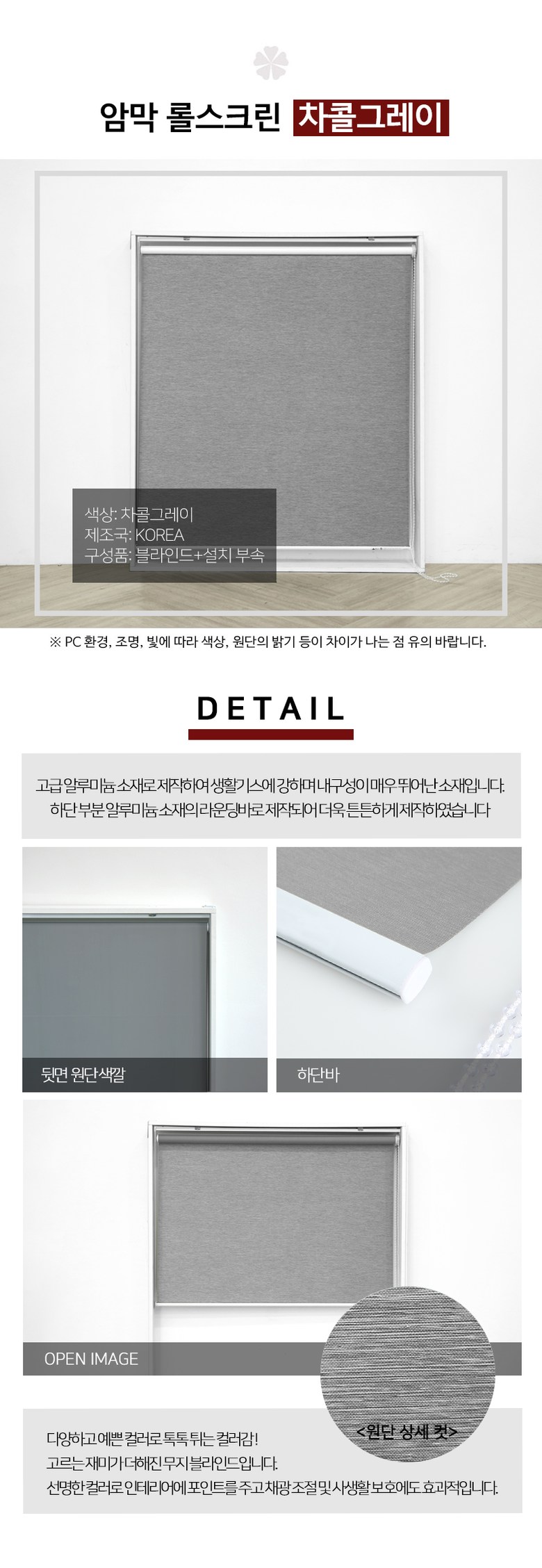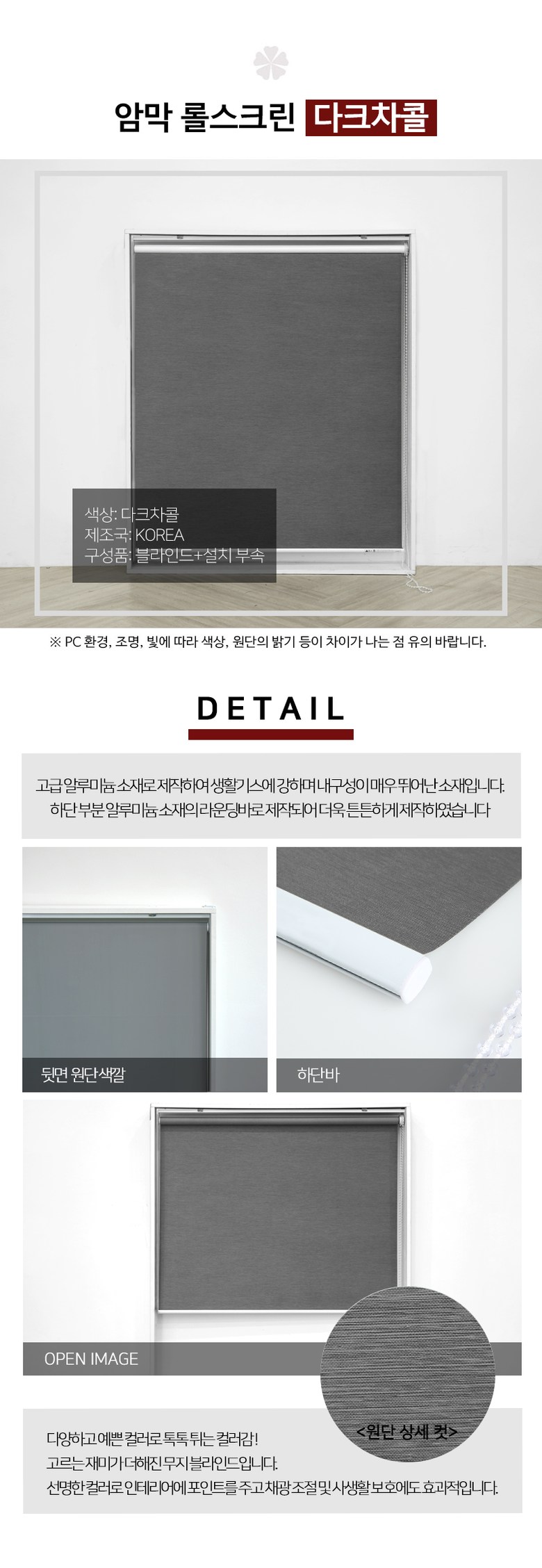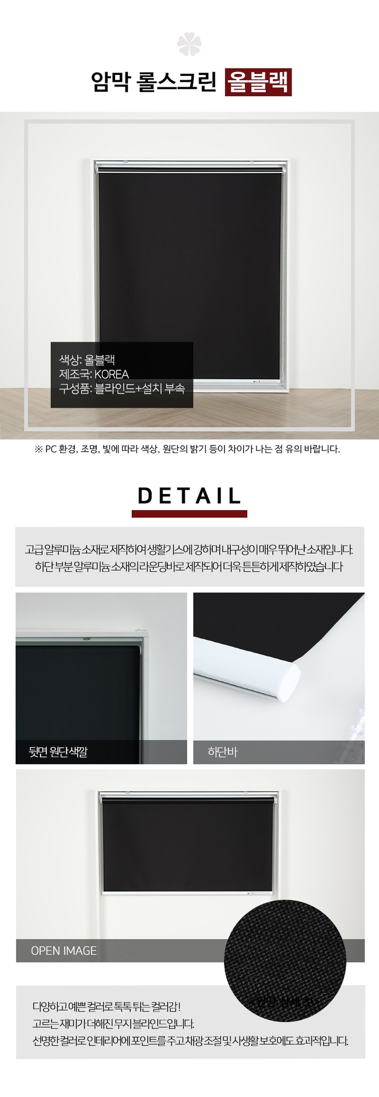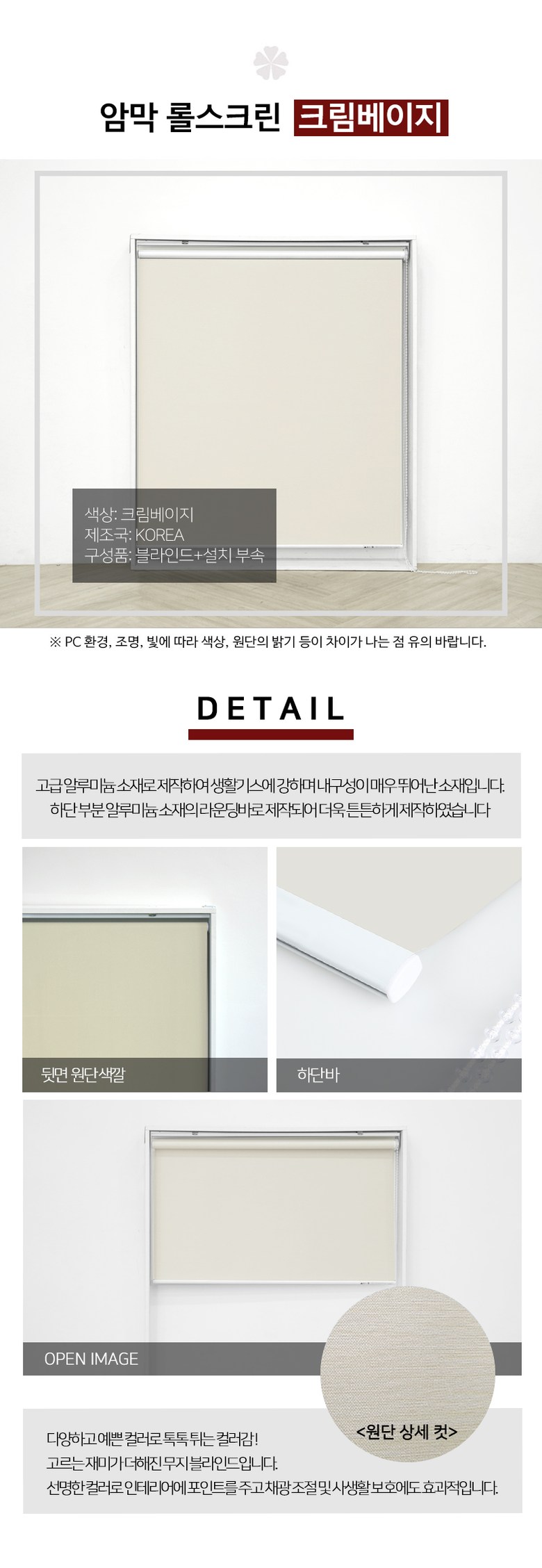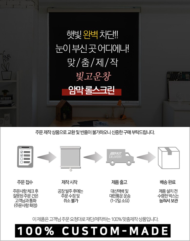| 치수 | 주문제작이며, 가로길이는 상단바 프레임의 길이이고 원단은 양쪽 합 2.5cm 내외 짧게 제작됩니다. 세로길이는 상단 프레임부터 하단바 끝까지의 길이입니다. | 제품구성 | 상세 페이지 참고 |