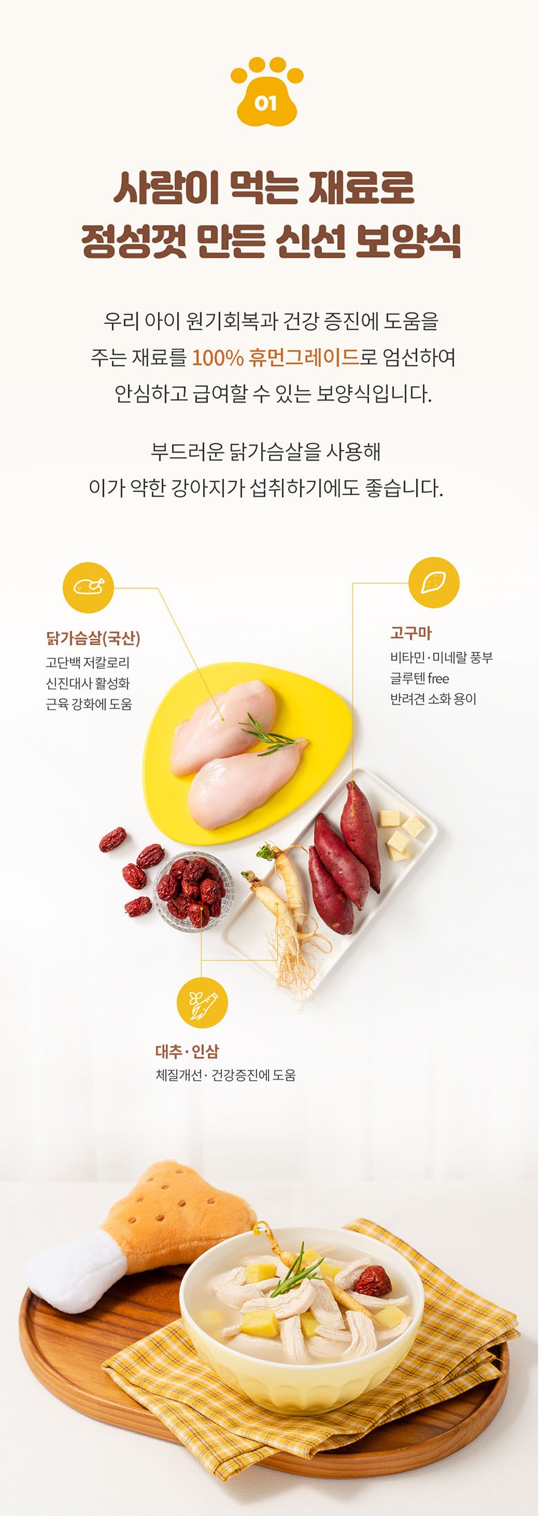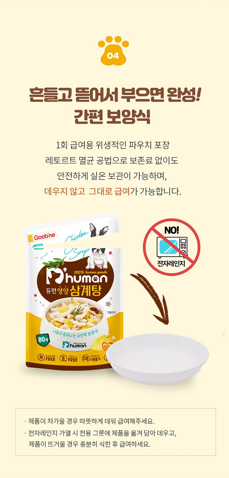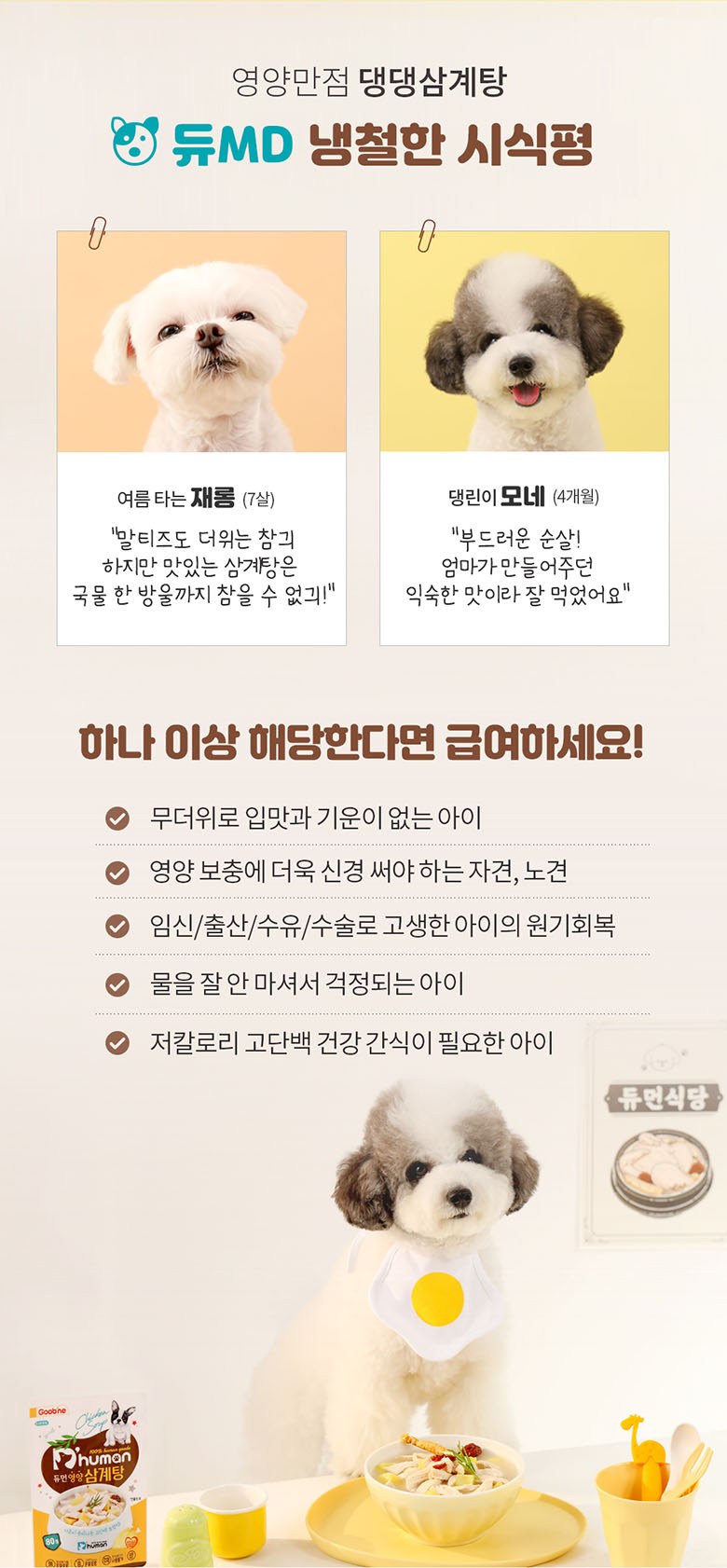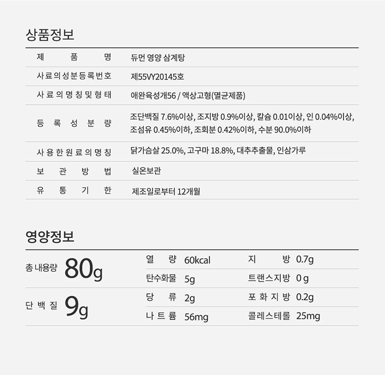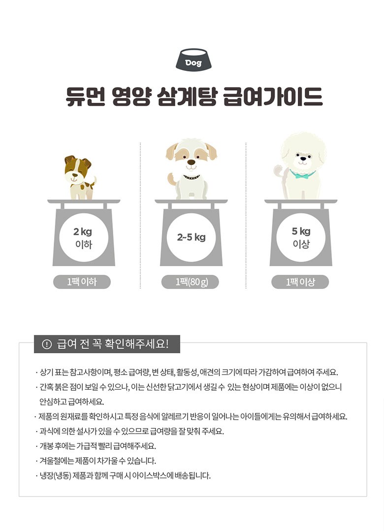 | 품명 및 모델명 | 듀먼 강아지 영양 삼계탕 80g | 인증사항 | 해당없음 |