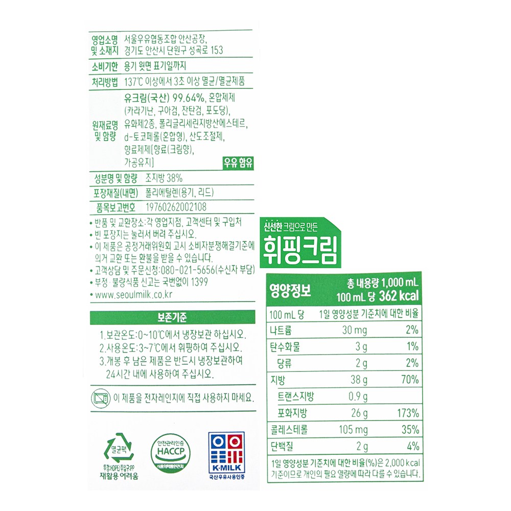 맛있는 휘핑크림은, 신선한 크림에서부터 출발해요. 서울우유의 오랜 노하우와 품질 좋은 유크림으로 완성한 휘핑크림을 만나보세요. 달콤하면서도 고소한 풍미가 조화롭게 느껴져 디저트 재료는 물론 과일을 찍어 먹는 디핑소스로 활용하셔도 좋아요. 고소한 크림 파스타가 생각날 때 휘핑크림만 있으면 깊은 풍미를 더할 수 있답니다.