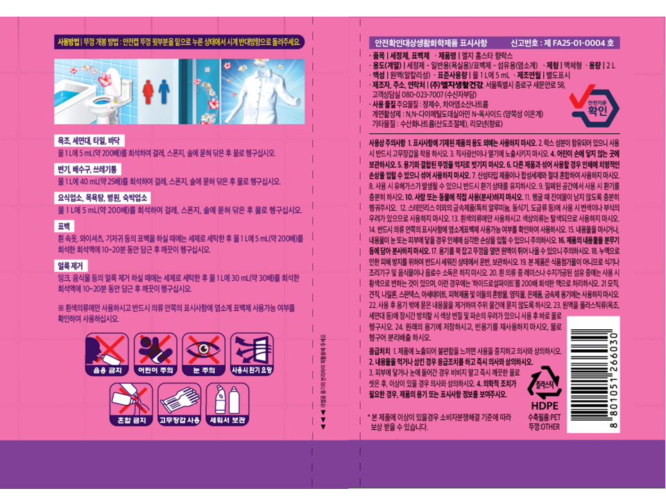 | 품목 및 제품명 | 세정제, 표백제/엘지 홈스타 향락스 | 용도(표백제의 경우 계열을 함께표시) 및 제형 | 세정제-일반용(욕실용)/표백제-섬유용(염소계) / 액체형 |