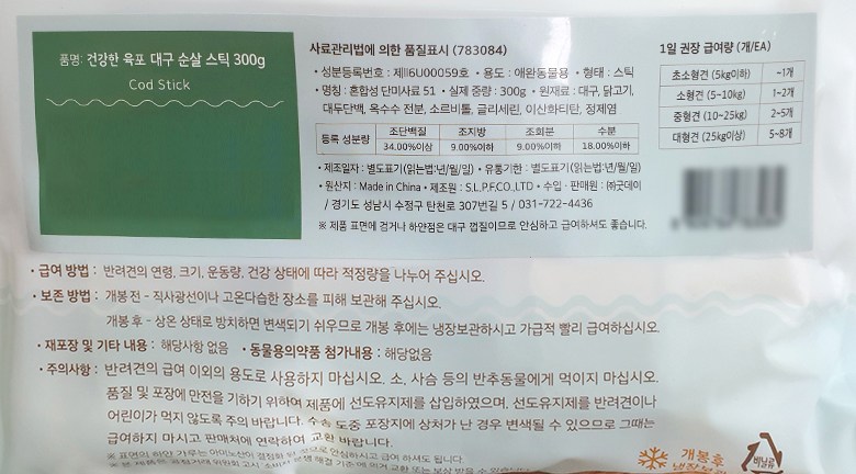 | 품명 및 모델명 | 건강한 육포 대구 순살 스틱 300g | 인증/허가 사항 | 사료관리법에 따른 성분등록번호 : 컨텐츠 참조 |