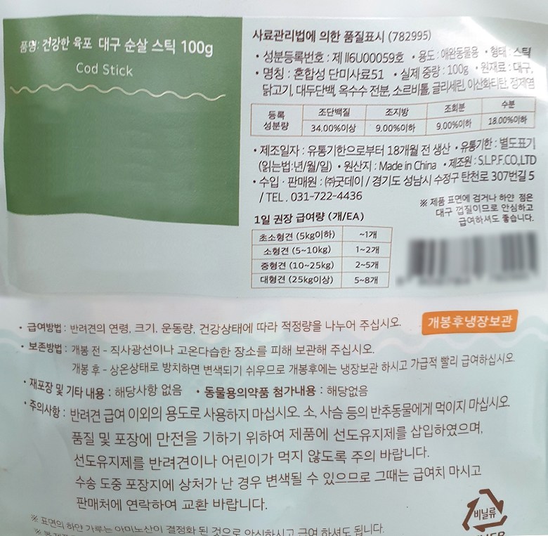 | 품명 및 모델명 | 건강한 육포 대구 순살 스틱 100g | 인증/허가 사항 | 사료관리법에 따른 성분등록번호 : 컨텐츠 참조 |
