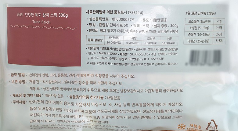 | 품명 및 모델명 | 건강한 육포 참치 스틱 300g | 인증/허가 사항 | 사료관리법에 따른 성분등록번호 : 컨텐츠 참조 |