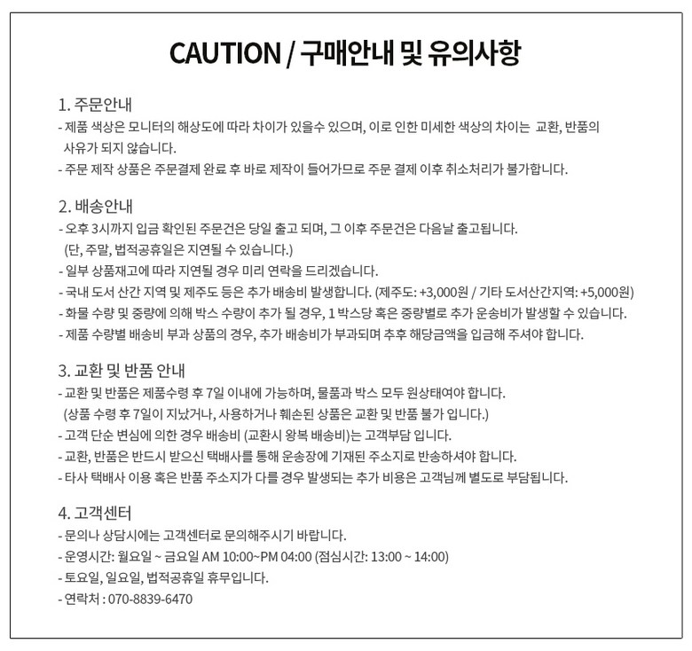 - ㆍ모니터 해상도의 차이로 인해 색상이나 이미지가 실제와 달라, 고객이 단순 변심으로 교환/반품을 무료로 요청하는 경우