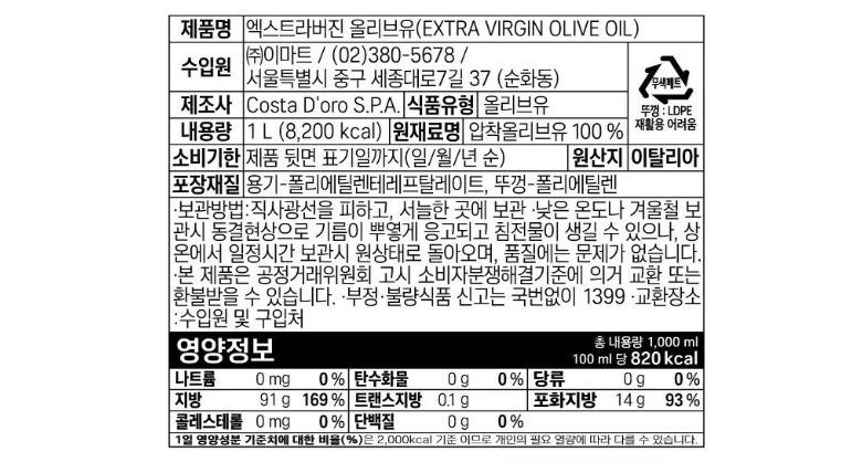 | 제품명 | 엑스트라버진 올리브유 | 식품의 유형 | 올리브유 |