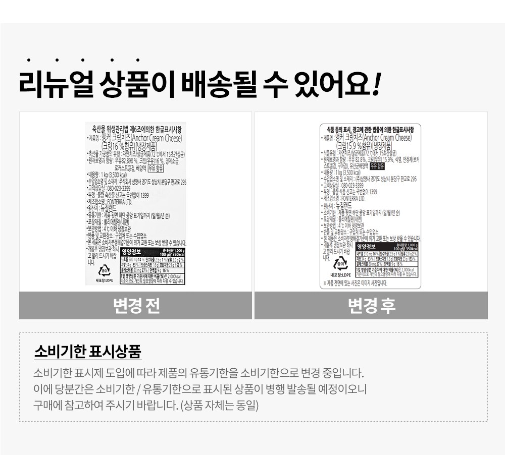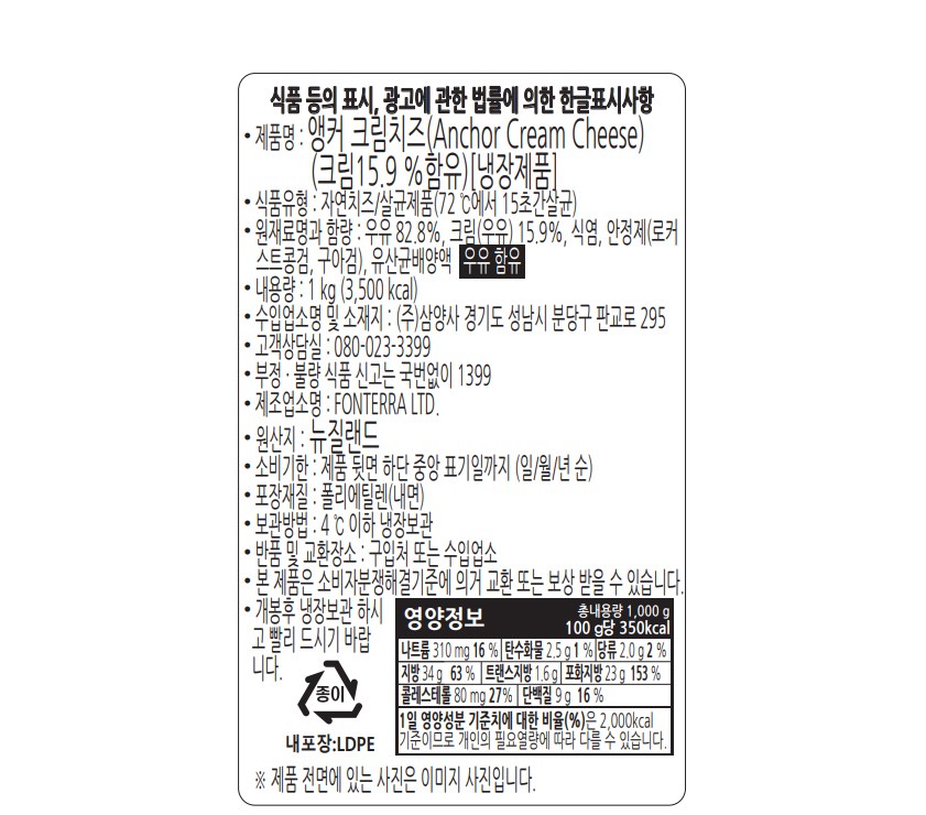 | 제품명 | 앵커 크림치즈 | 식품의 유형 | 컨텐츠 참조 |