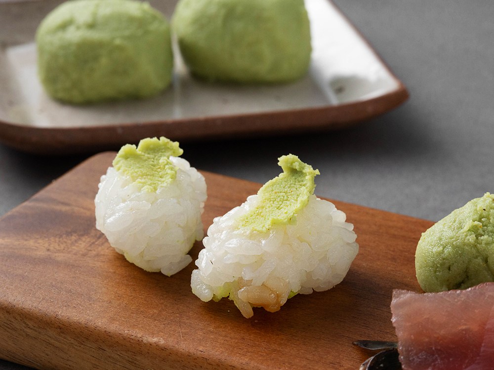 2. 초밥을 가볍게 뭉쳐 모양을 만든 후 와사비를 묻혀주세요.