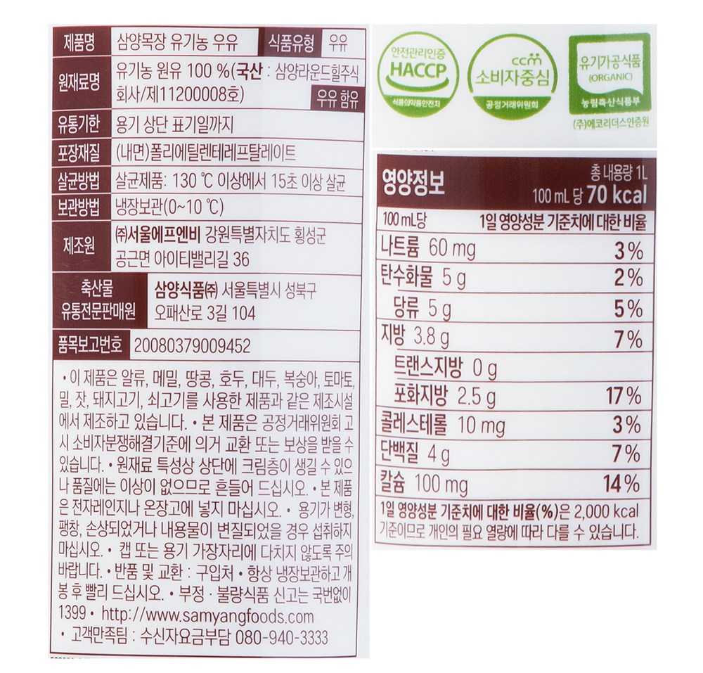 | 제품명 | 삼양목장 유기농우유 | 식품의 유형 | 컨텐츠 참조 |