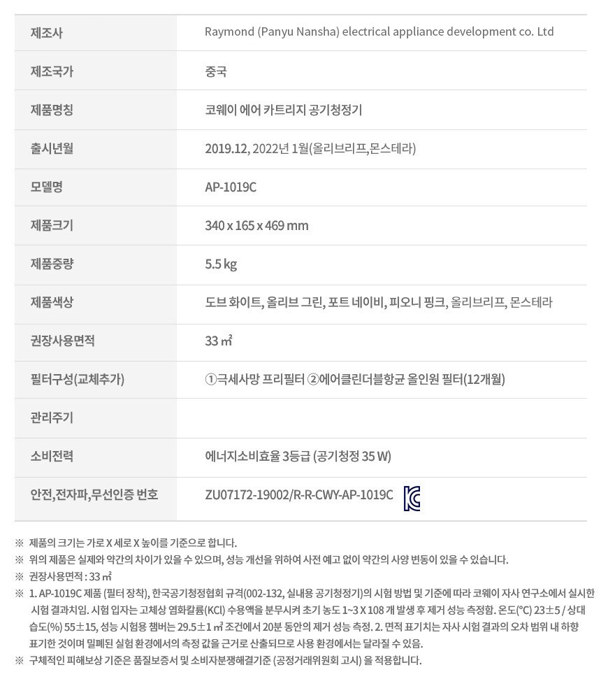 | 품명 및 모델명 | 코웨이 에어 카트리지 아트 공기청정기 올리프리프/ AP-1019C | KC 인증정보 | ZU07172-19002E, R-R-CWY-AP-1019C |