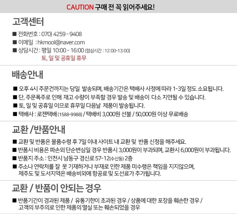 - ㆍ모니터 해상도의 차이로 인해 색상이나 이미지가 실제와 달라, 고객이 단순 변심으로 교환/반품을 무료로 요청하는 경우