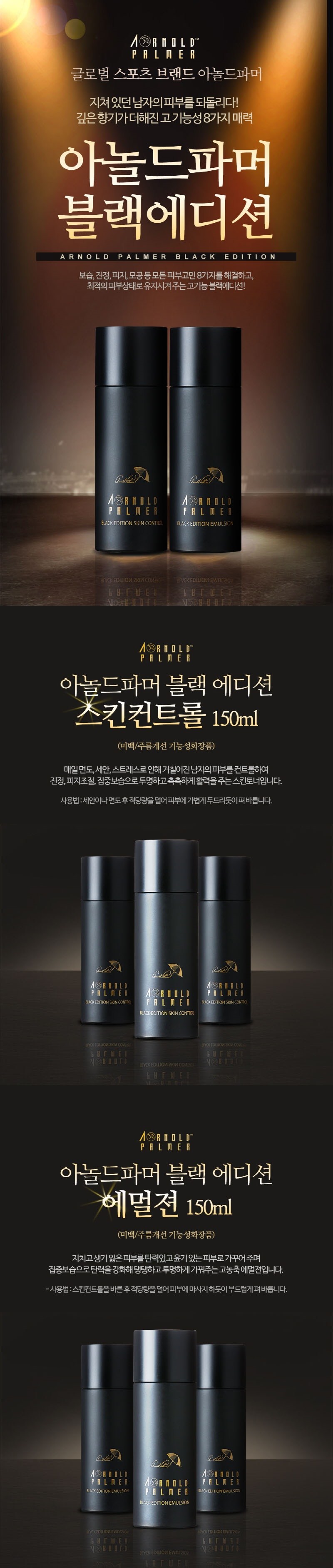 | 사용기한 또는 개봉 후 사용기간 | 본 상품은 해당 물류센터 직발송 상품인 관계로 제조연월일 및 사용기한 정보가 매번 변경되므로 상단 사용기한 정보를 참고해 주세요. | 사용방법 | [아놀드파머 블랙 에디션 스킨컨트롤] 세안이나 면도 후 적당량을 피부에 가볍게 두드리듯이 펴 바릅니다. [아놀드파머 블랙 에디션 에멀젼] 스킨컨트롤을 바른 후 적당량을 덜어 피부에 마사지 하듯이 부드럽게 펴 바릅니다. |