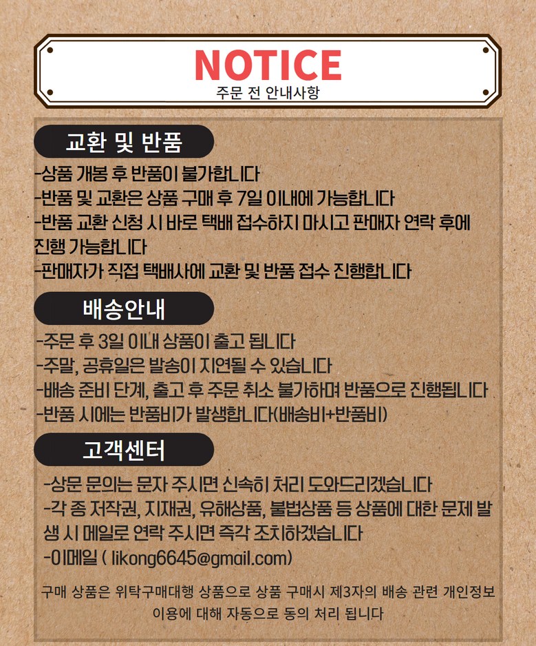 - ㆍ모니터 해상도의 차이로 인해 색상이나 이미지가 실제와 달라, 고객이 단순 변심으로 교환/반품을 무료로 요청하는 경우