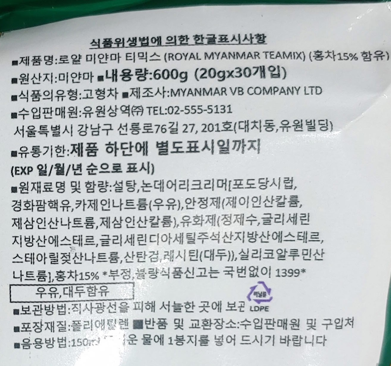| 제품명 | 로얄 미얀마 티믹스 | 식품의 유형 | 고형차 |